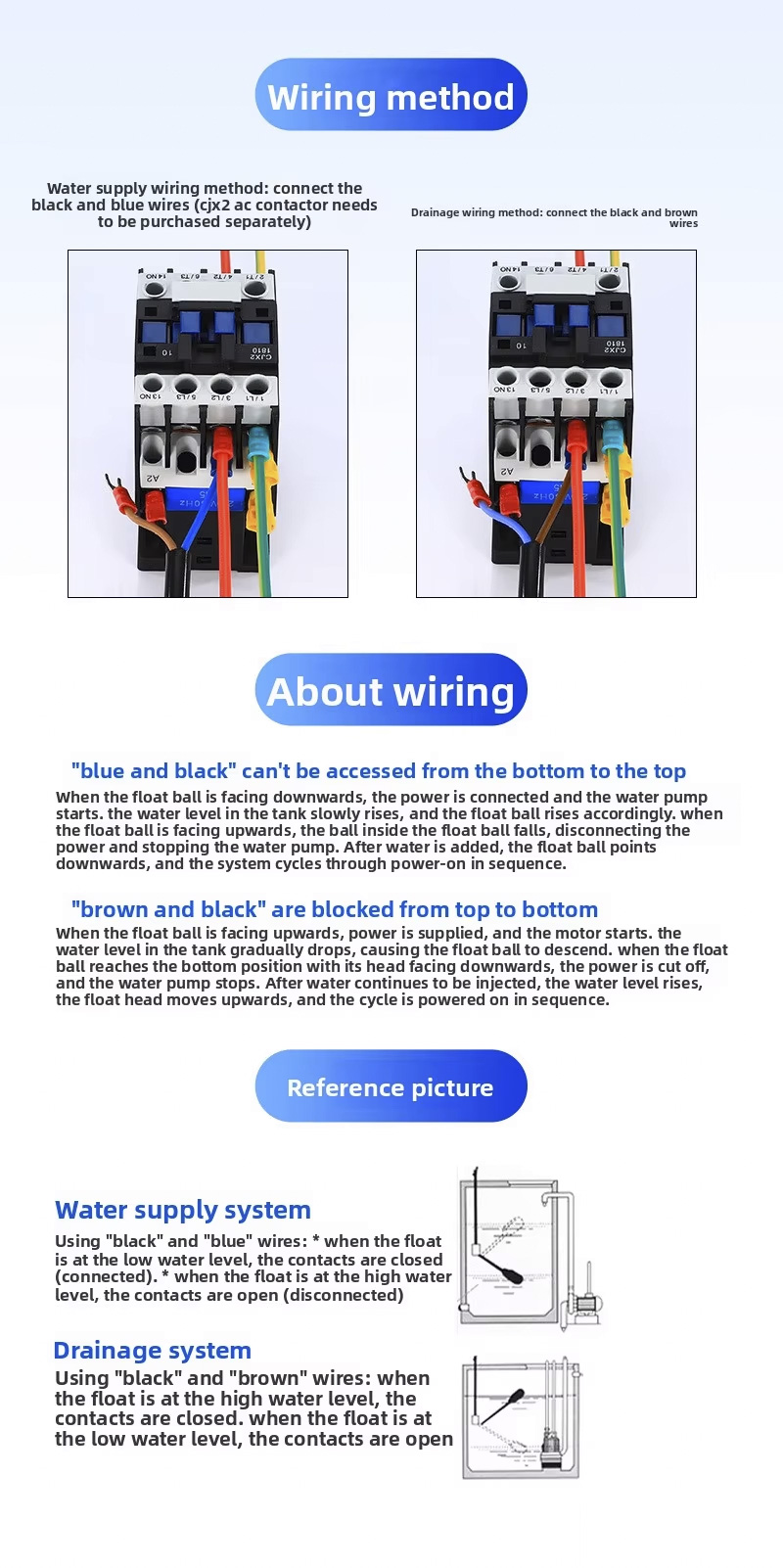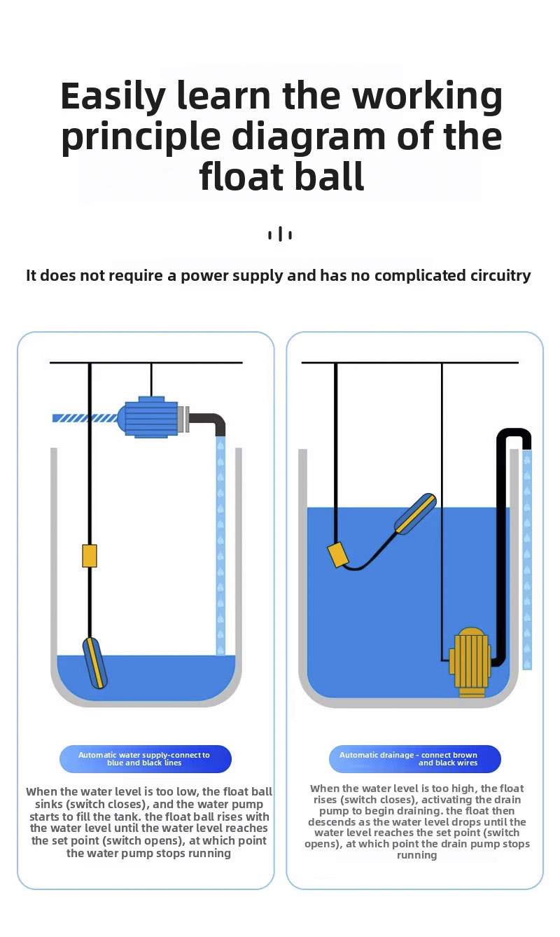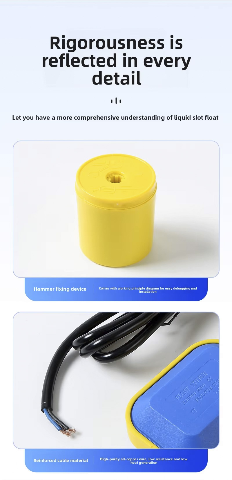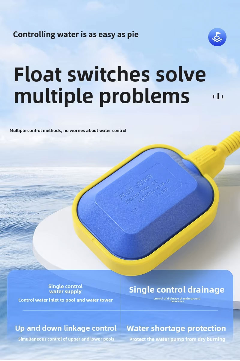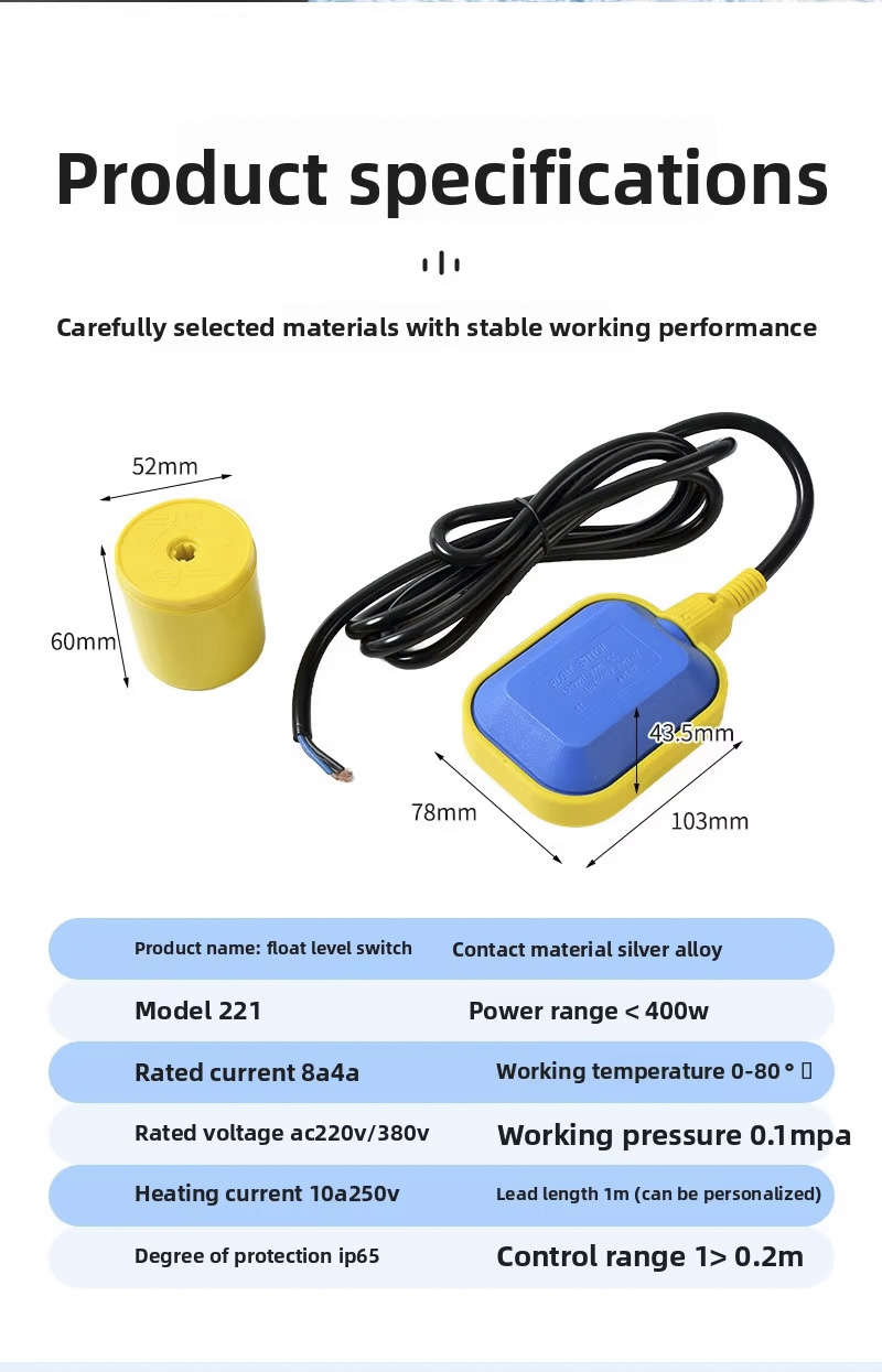 Овај прекидач са пловком има велики кружни дизајн са 2м、3м、5м、10м, ИП68 степеном заштите, и ради на температурама од 0℃ до 80℃, Подржава широк опсег напона од 110В до 220В и има робустан радни притисак од ±0М, робустан ласерски прилагођени производ је ±0. логотипи или ОЕМ/ОДМ услуге, осигуравајући прилагодљивост за различите апликације.