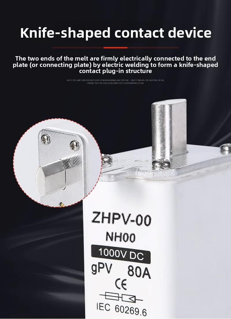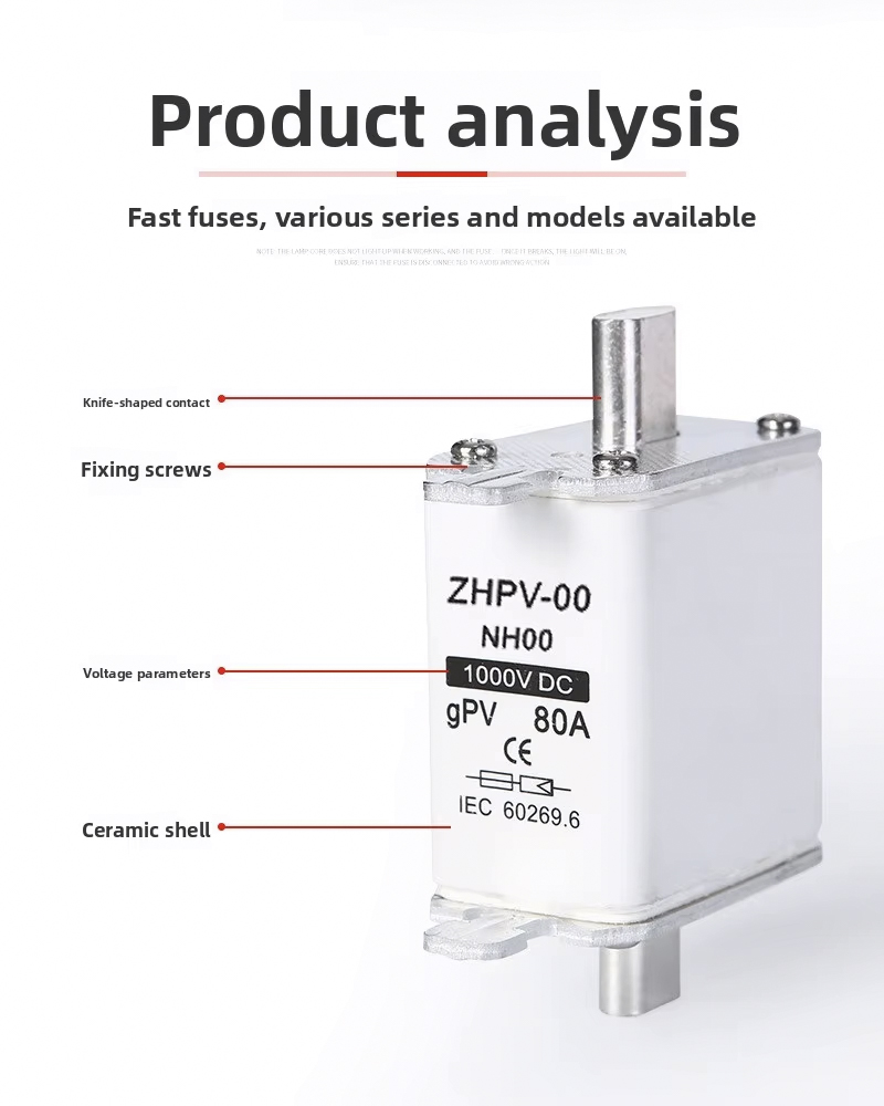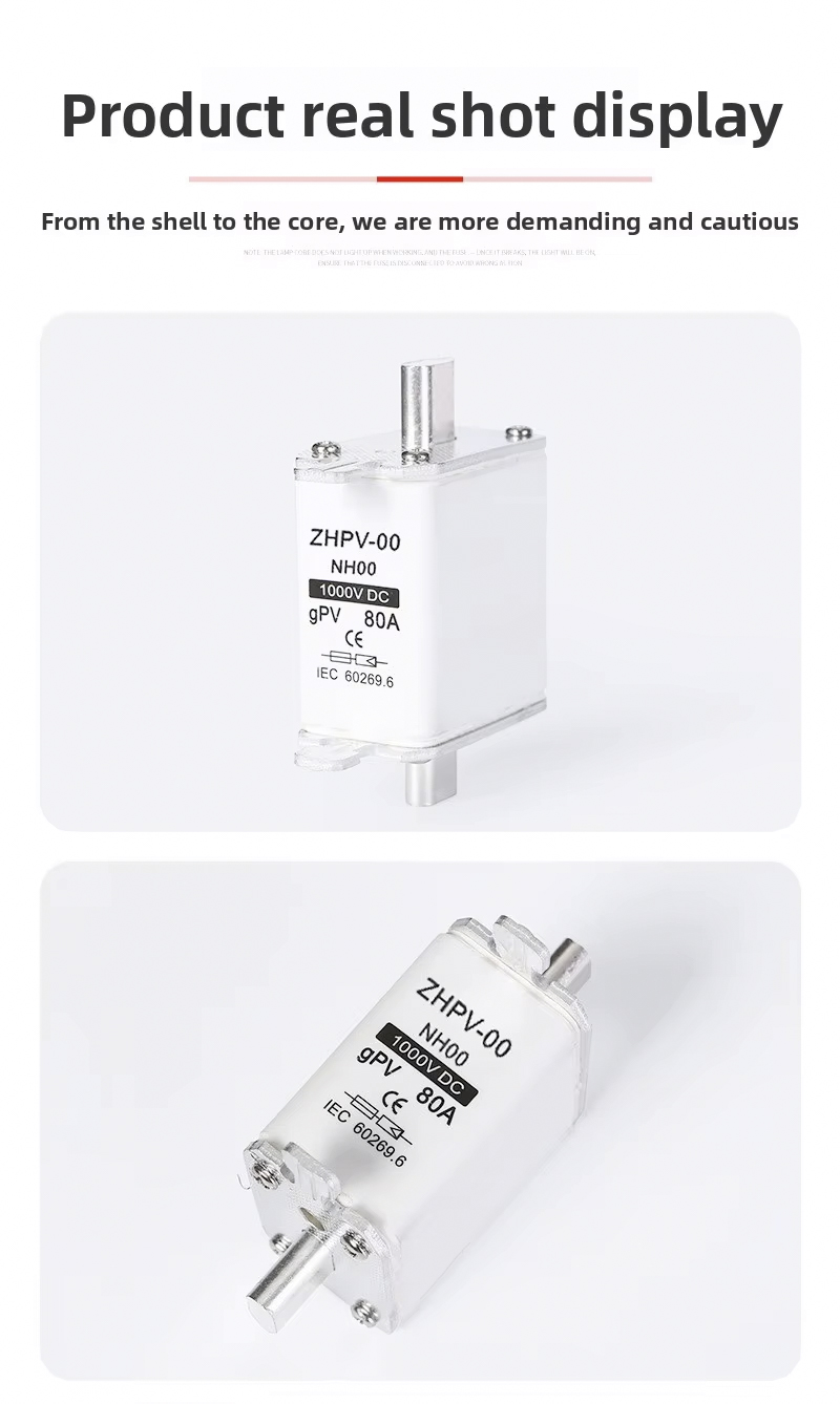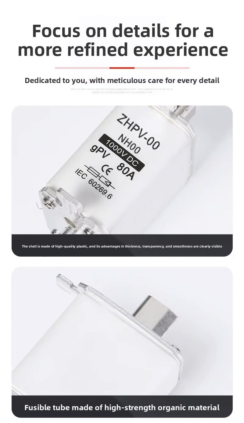 НХ00-1000В ИЕЦ нисконапонски фотонапонски ножни осигурач пластични 80А 6ка прекидни капацитет је дизајниран за ефикасну и поуздану заштиту кола у фотонапонским системима и другим нисконапонским апликацијама. Овај висококвалитетни осигурач ради до 1000В, са робусним прекидним капацитетом од 6ка, осигуравајући безбедно искључивање у случају преоптерећења или кратких спојева. Његова називна струја од 80А чини га погодним за различите фотонапонске инсталације и индустријске контролне табле.