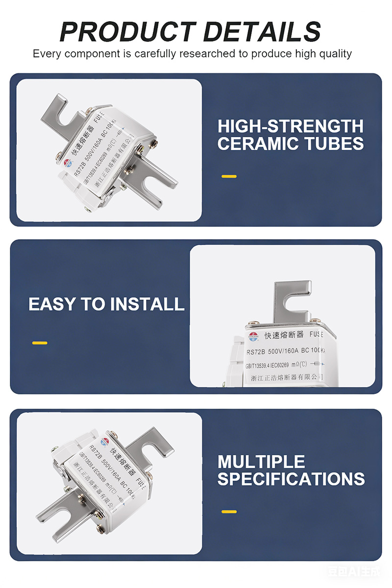 Овај производ је погодан за апликације као што су енергетски системи, разводни ормани, трансформатори, итд., осигуравајући сигуран рад кола. РС72Б 500В 160А БЦ 100КА карике са осигурачима имају карактеристике брзог одзива и могу брзо да прекину струју у случају квара, штитећи низводну опрему. Његов називни напон је 500В, а називна струја је 160А, што испуњава међународне стандарде. Једноставан за инсталацију и одржавање, погодан за различите индустријске примене. Осигурачи РС72Б 500В 160А БЦ 100КА стекли су признање бројних корисника за своје стабилне и поуздане перформансе, што га чини идеалним избором за осигурање сигурности електроенергетских система.